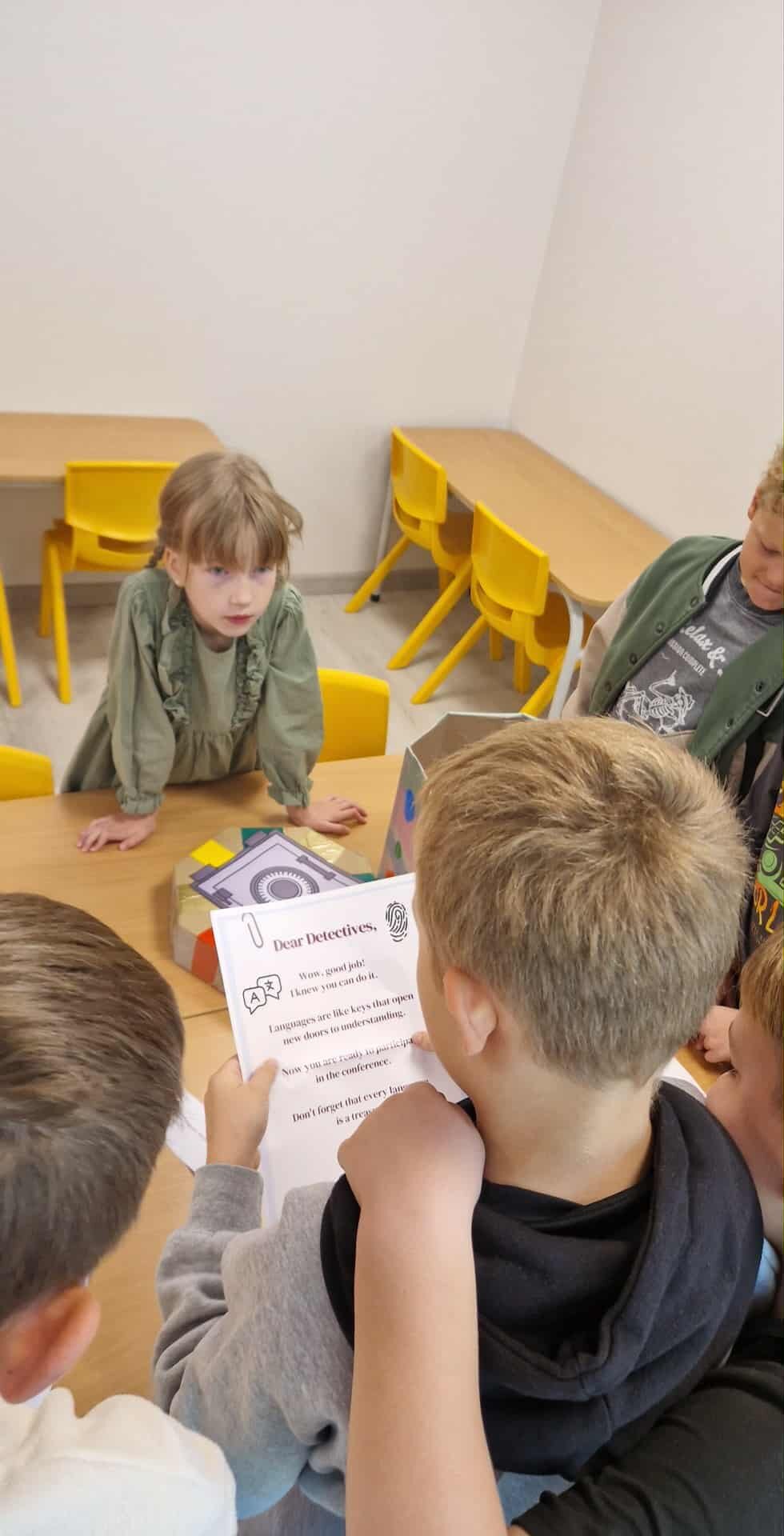 2-4 klasių mokiniai, kartu su anglų kalbos mokytojomis, turėjo galimybę šią dieną įprasminti veiklomis, atliekamomis pabėgimo kambario principu. Dirbdami komandomis, mokiniai keliavo per tris skirtingus lygius (skirtingas patalpas), kuriose savo kalbų mokėjimą atskleidė atlikdami įvairias užduotis: raktų su kalbomis paieška, pradėtų įdomių faktų užbaigimu, Eurovizijos dainų spėjimu, kryžiažodžiais ir šifravimo užduotimis. Kiekviename kambaryje mokiniai atlikdavo smagias užduotis tam, kad galėtų pereiti į kitą lygį, o tai buvo puiki proga įsikūnyti į tikrą detektyvų komandą.