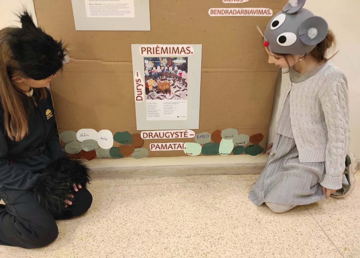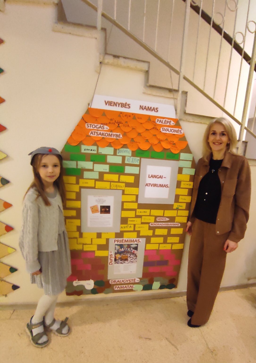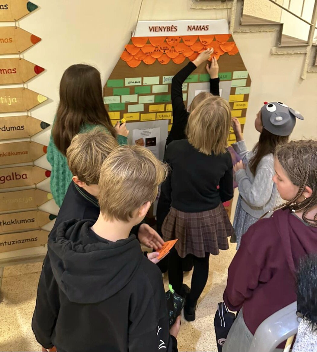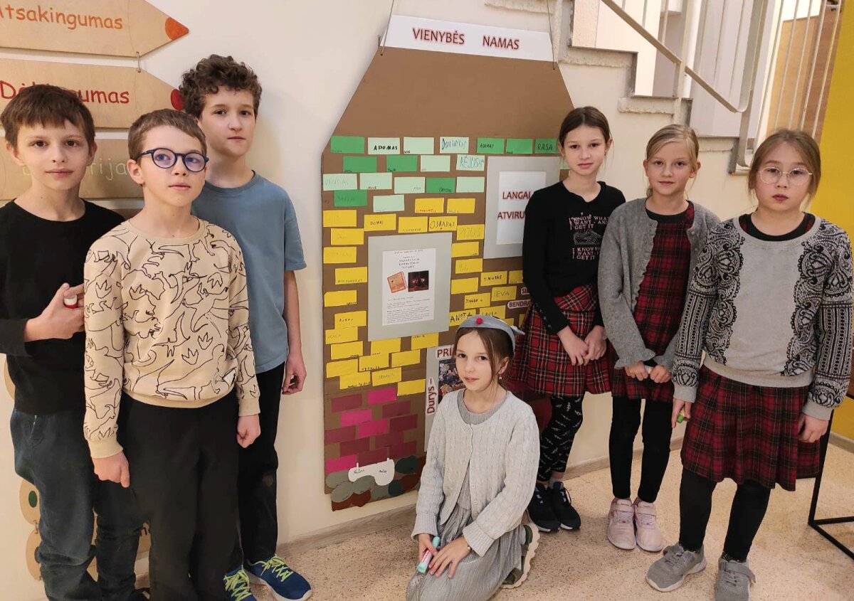 Po skaitymo trečiokai, pasipuošę knygos herojų – šuns, katės ir pelės – kostiumais, kvietė į „Vienybės namo“ statymo veiklą. Pirmokai „išliejo“ pamatus, 2A, 3A, 3B ir 4A klasės bendradarbiavo „mūrydamos“ sienas, o 4B ir 4C mokiniai „uždengė“ stogą. Taip visi kartu simboliškai pastatė namą, kuriame telpa draugystė, supratimas ir bendrystė.