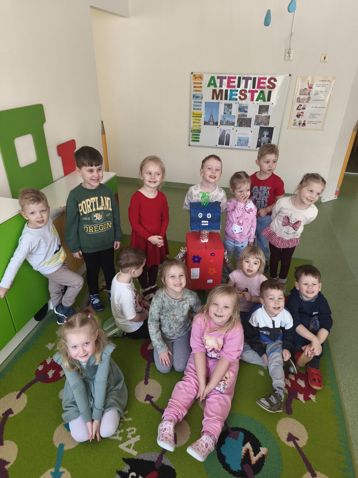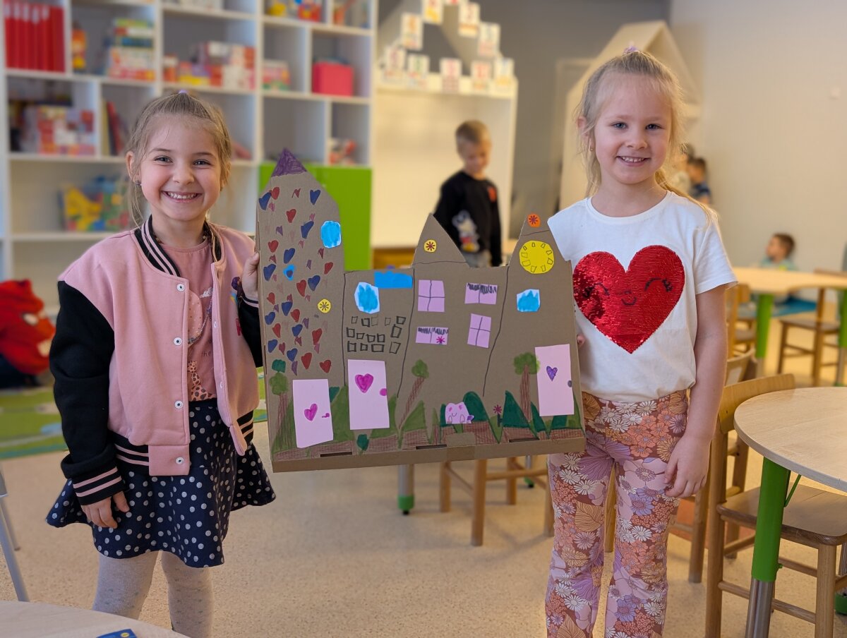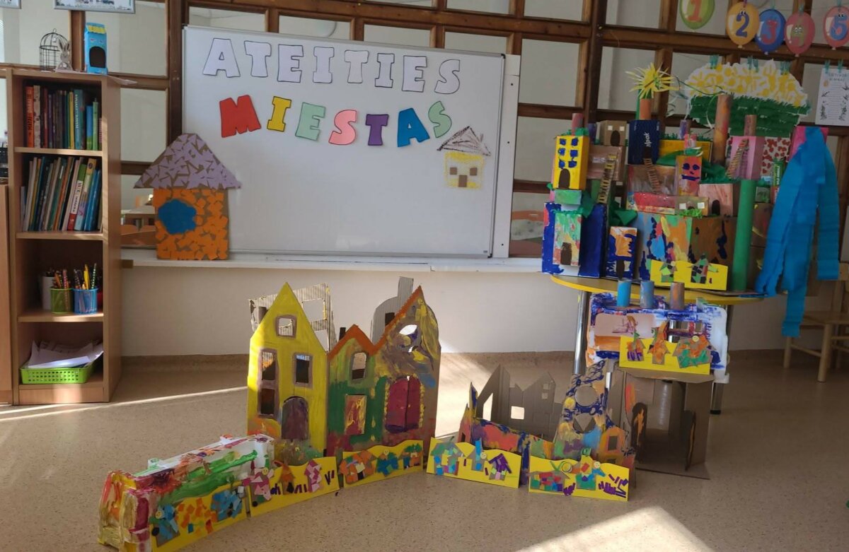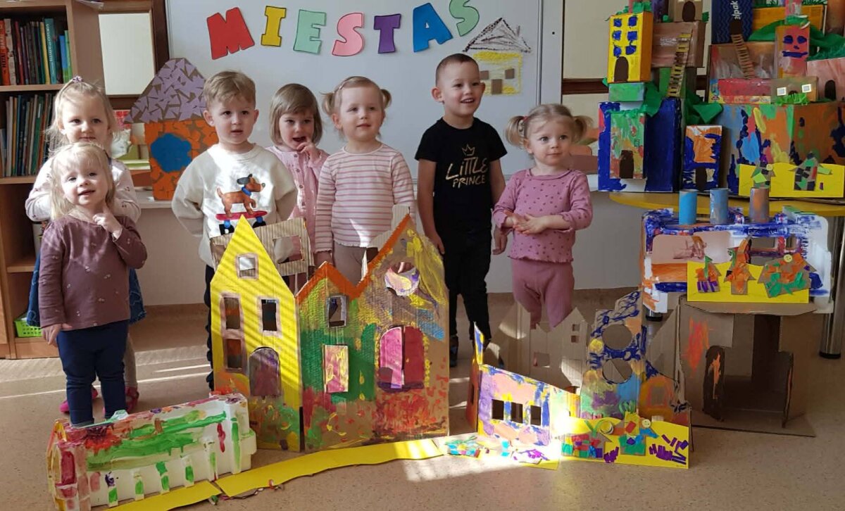 Dvi savaites vaikai kartu su mokytojomis leidosi į įkvepiančią kelionę po ateitį ir svarstė, kaip galėtų atrodyti miestai po daugelio metų. „Kodėlčiukų“ grupės ugdytiniai kūrė savo svajonių miestus: piešė spalvingus dangoraižius, tiesė kelius, projektavo parkus ir įvairius pastatus. Vaikų fantazija neturėjo ribų – jų miestuose skraidė ne tik lėktuvai, bet ir ateivių erdvėlaiviai! Ypatingo džiaugsmo suteikė kūryba iš antrinių žaliavų. Iš paprastų tualetinio popieriaus rulonėlių gimė spalvingos mašinėlės, kurios tapo svarbia miesto gyvenimo dalimi. Vaikai su jomis žaidė, kūrė judraus miesto scenarijus, vaidino įvairias situacijas ir pasakojo istorijas. „Gudručių“ ir „Smalsučių“ grupių vaikai kūrė ateities namus, konstravo robotus ir netgi pastatė Robotų miestą. Jie diskutavo, koks galėtų būti ateities transportas, kokius darbus atliktų robotai, kokie statiniai būtų reikalingi. Vaikai svarstė ir apie gamtos svarbą – ar ant namų stogų galėtų augti vaisiai, daržovės, medžiai ar gėlės, ir kodėl ateities mieste būtini parkai bei žaliosios erdvės. Tuo tarpu „Pabiručių“ ir „Naminukų“ grupės ugdytiniai, pasitelkę kartonines dėžes ir LEGO konstruktorius, kūrė miestų maketus, kurie virto tikrais žaidimų pasauliais. Jų miestuose atsirado svarbiausi objektai – policijos nuovada, ligoninė, viešbučiai, picerija. Vaikai nustebino savo jautrumu – jie sukūrė ir šunų prieglaudą, parodydami rūpestį gyvūnais.