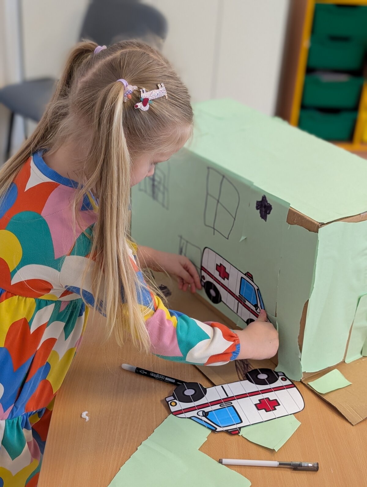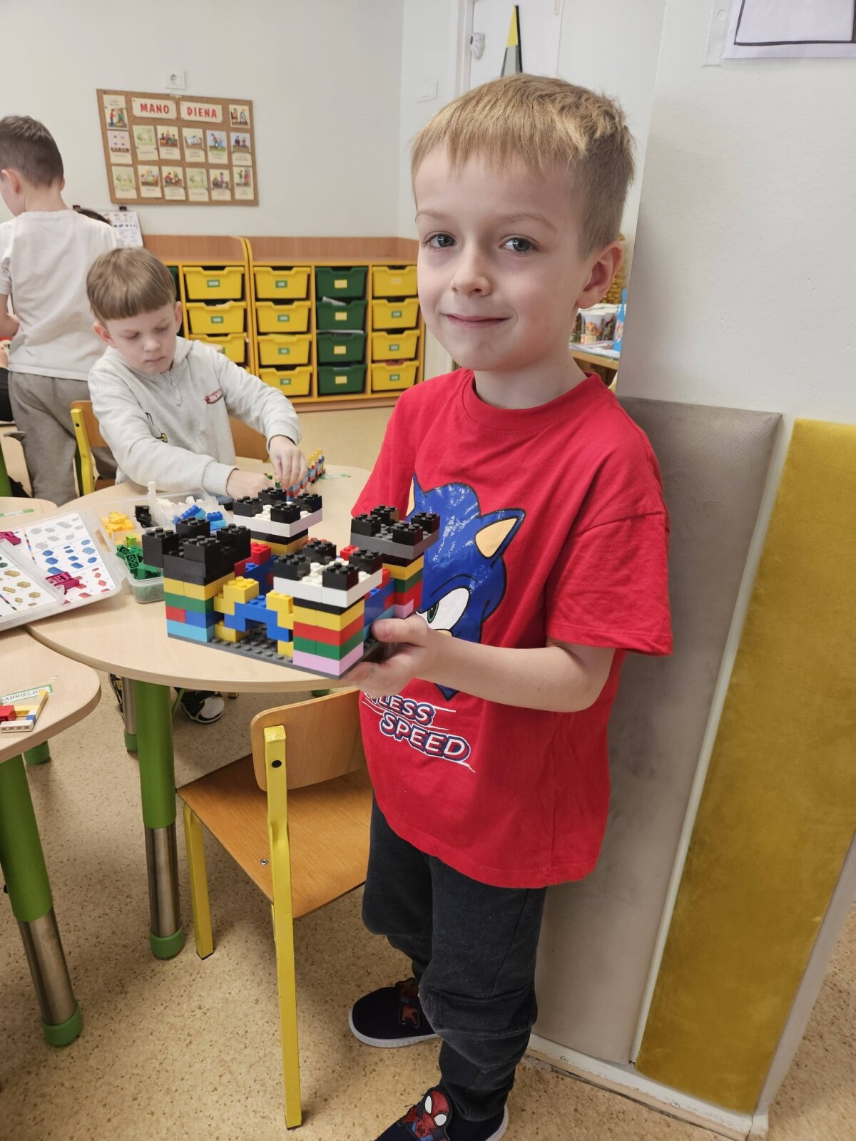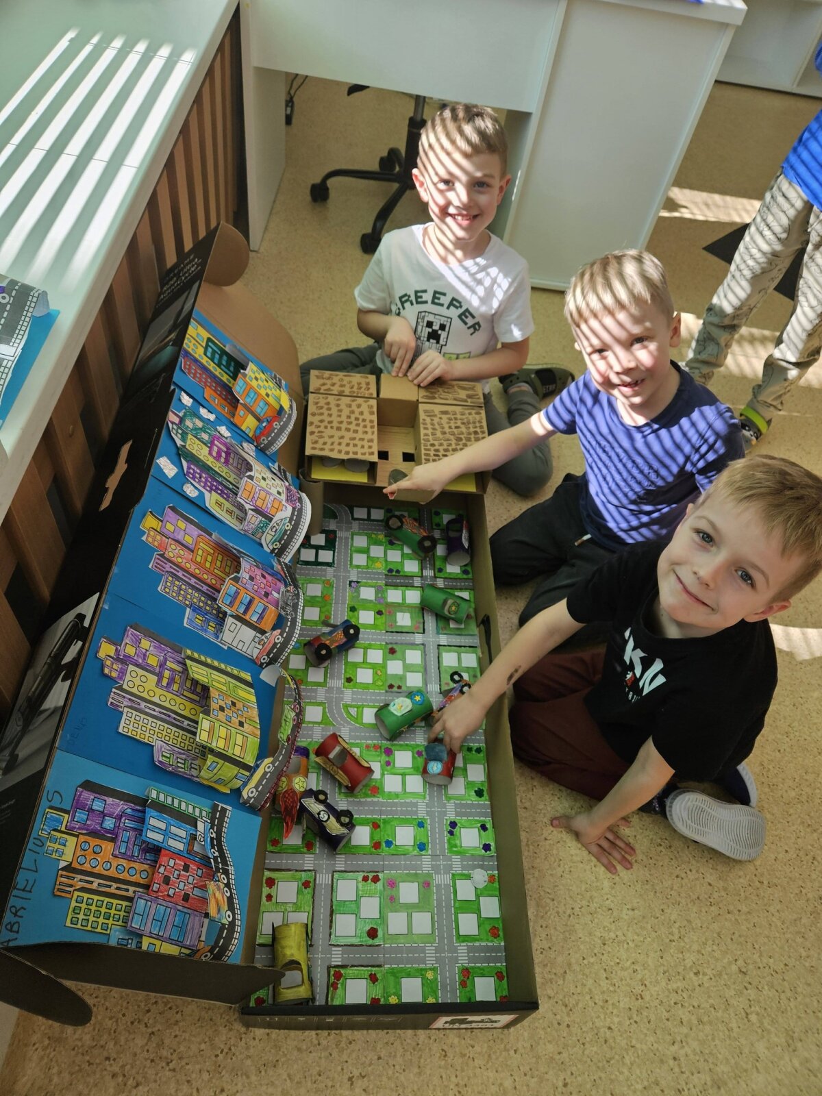 Dvi savaites vaikai kartu su mokytojomis leidosi į įkvepiančią kelionę po ateitį ir svarstė, kaip galėtų atrodyti miestai po daugelio metų. „Kodėlčiukų“ grupės ugdytiniai kūrė savo svajonių miestus: piešė spalvingus dangoraižius, tiesė kelius, projektavo parkus ir įvairius pastatus. Vaikų fantazija neturėjo ribų – jų miestuose skraidė ne tik lėktuvai, bet ir ateivių erdvėlaiviai! Ypatingo džiaugsmo suteikė kūryba iš antrinių žaliavų. Iš paprastų tualetinio popieriaus rulonėlių gimė spalvingos mašinėlės, kurios tapo svarbia miesto gyvenimo dalimi. Vaikai su jomis žaidė, kūrė judraus miesto scenarijus, vaidino įvairias situacijas ir pasakojo istorijas. „Gudručių“ ir „Smalsučių“ grupių vaikai kūrė ateities namus, konstravo robotus ir netgi pastatė Robotų miestą. Jie diskutavo, koks galėtų būti ateities transportas, kokius darbus atliktų robotai, kokie statiniai būtų reikalingi. Vaikai svarstė ir apie gamtos svarbą – ar ant namų stogų galėtų augti vaisiai, daržovės, medžiai ar gėlės, ir kodėl ateities mieste būtini parkai bei žaliosios erdvės. Tuo tarpu „Pabiručių“ ir „Naminukų“ grupės ugdytiniai, pasitelkę kartonines dėžes ir LEGO konstruktorius, kūrė miestų maketus, kurie virto tikrais žaidimų pasauliais. Jų miestuose atsirado svarbiausi objektai – policijos nuovada, ligoninė, viešbučiai, picerija. Vaikai nustebino savo jautrumu – jie sukūrė ir šunų prieglaudą, parodydami rūpestį gyvūnais.