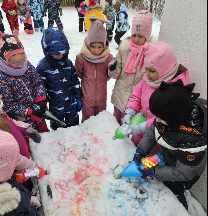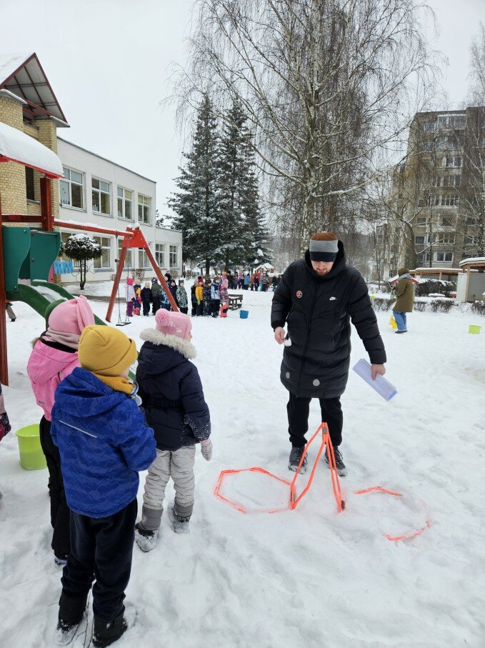 Po aktyvių išbandymų laukė dar viena smagi staigmena – kūrybinė veikla ant sniego. Į rankas paėmę vandenyje ištirpdytais dažais pripildytus indelius, vaikai piešė tiesiai ant baltos žiemos paklodės. Netrukus sniegas nusidažė ryškiomis spalvomis, atsirado saulės, gėlės, debesėliai ir paslaptingi raštai. Vaikų fantazija liejosi laisvai, o kūrybos džiaugsmas buvo toks pat didelis kaip ir sportinių rungčių azartas.